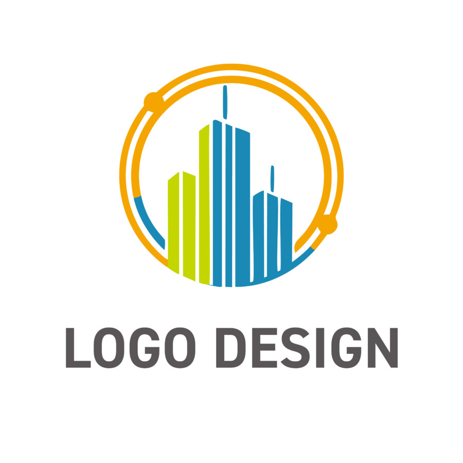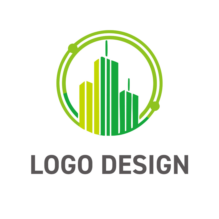 このロゴデザイン原案が描いているのは、単なるビルが立ち並ぶ都市の姿ではありません。中心にあるビル群は、縦のラインが強調されることで成長性や発展を示唆しつつ、その全てが鮮やかな緑色で彩られています。これは、建物そのものが環境配慮型であったり、グリーンエネルギーによって活動していたりすることを象徴しているようです。