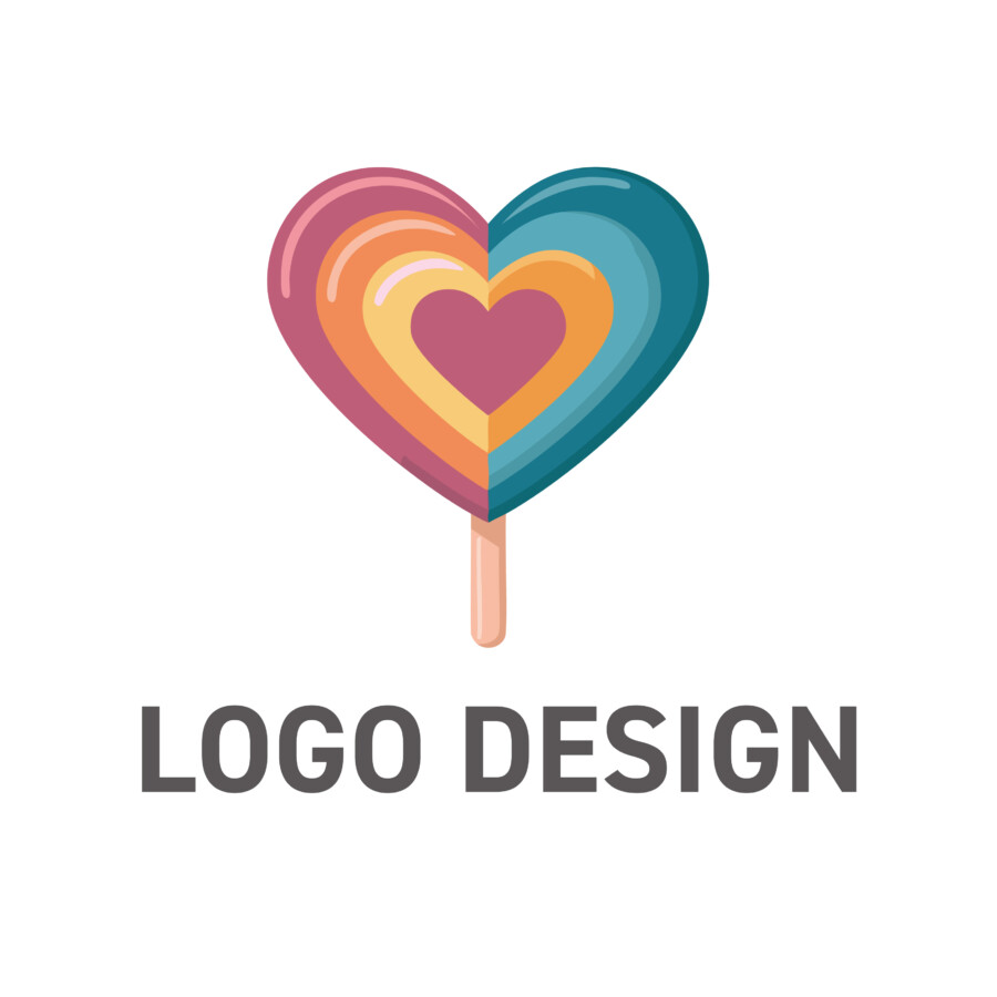 まるで虹を閉じ込めたような、カラフルなハート型のロリポップ。このロゴ原案は、見るだけで心が弾み、楽しい気分にさせてくれますね。赤、オレンジ、黄色、そして青系の鮮やかな色の層が、ポップでハッピーな雰囲気を醸し出しています。