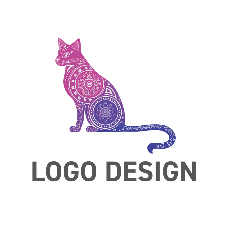 優雅に座る猫のシルエットは、それ自体が普遍的な魅力を備えていますが、このデザインの真髄は、その体に施された緻密でエキゾチックな文様にあります。マンダラを思わせる円形のパターンや、繊細な線で描かれた幾何学模様、花をモチーフにしたような装飾が、猫の全身を彩っています。これらの文様は、古代文明の神秘や、東洋的な宇宙観、あるいは手仕事の温もりといった、奥深い物語性を感じさせてくれます。さらに、ピンクから紫、そして深い青へと流れるように変化するグラデーションカラーは、このロゴに夢幻的で高貴な雰囲気を与え、見る人の心に静かな感動を呼び起こすことが期待できます。猫の持つしなやかさと、装飾的な文様の美しさ、そして色彩の妙なる調和が、唯一無二の存在感を生み出しています。